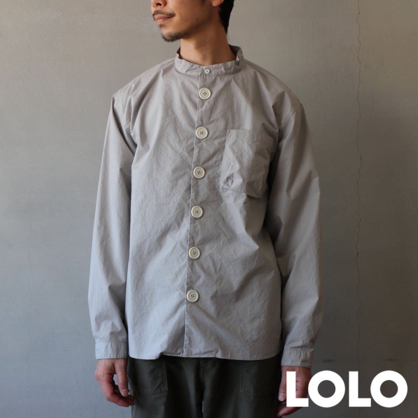 LOLO スタンドカラーデカボタンシャツ グレー M/L/XL 長袖