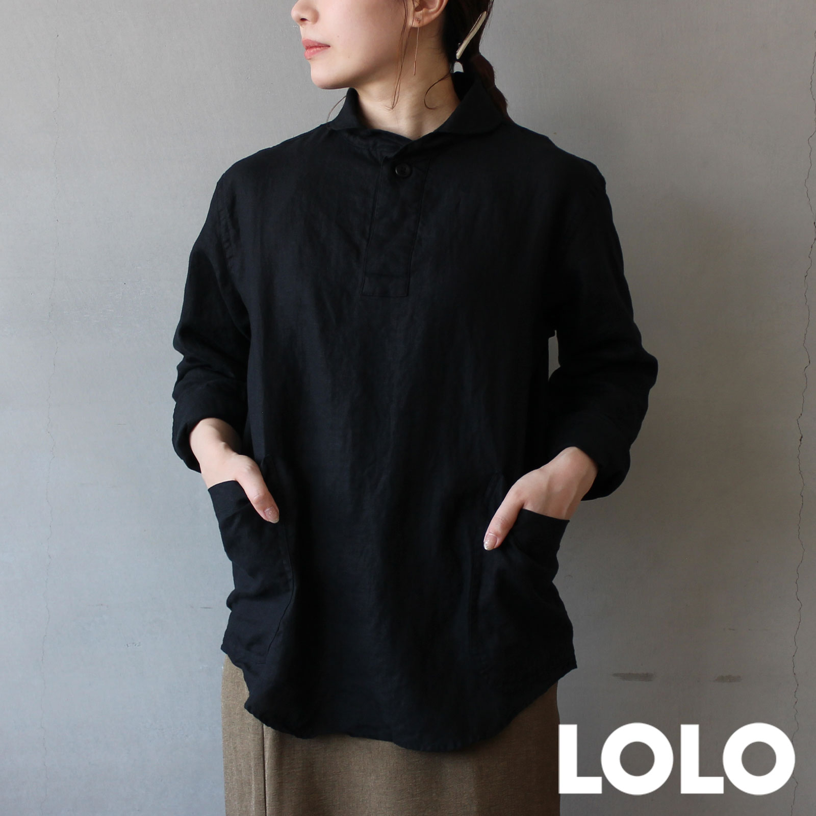 LOLO 定番プルオーバーリネンシャツ ブラック M/L/XL