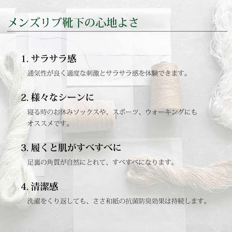 疲れがたまりやすい足を、ささ和紙独特の気持ちのいい刺激とやさしさで包み込むソックスです。抜群の吸汗性と天然のくまざさ成分の抗菌防臭効果で足のムレや汗によるべとつき、気になる臭いも防ぎます。ビジネスシーンも快適。エチケットも気配りできます。
