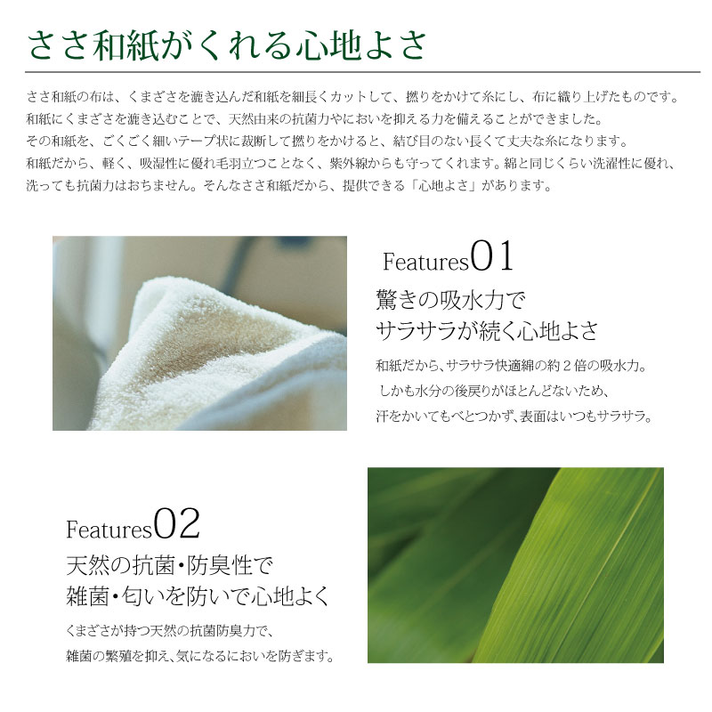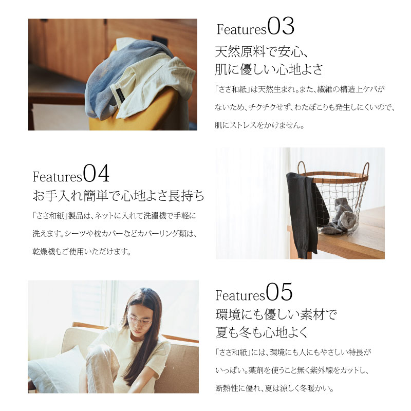 ささ和紙独特の涼やかなタッチが肌に心地よくしかも吸汗性に富んでいるためサラサラの爽やかさ。