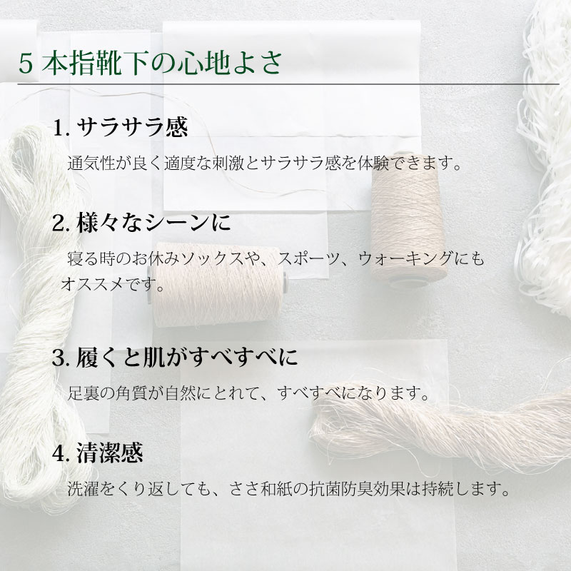 さらさらの感触と抜群の吸汗性で、足指の1本1本まで包むささ和紙の5本指ソックス。天然のくまざさ成分が菌の繁殖を抑えて、いつも清潔。