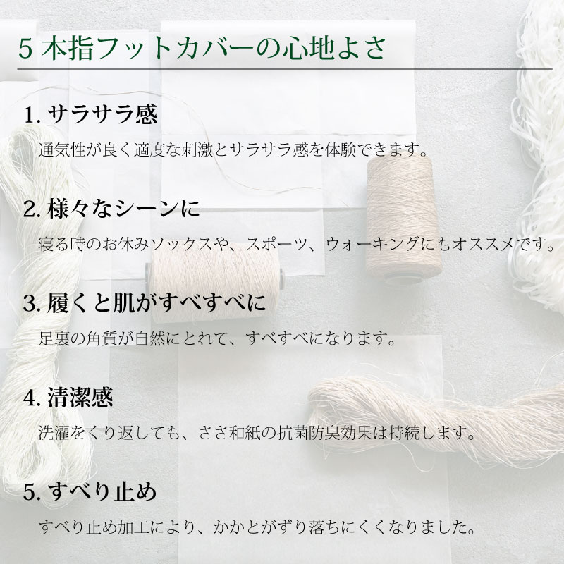 ノンストッキングでパンプスをはきたいけれど汗で足がべたついたり、ムレるのはイヤ。そんな女性たちの悩みをささ和紙が解消します。5本指タイプだから、足の指の間までさらさらで清潔。ストッキングの内側にはいても快適です。