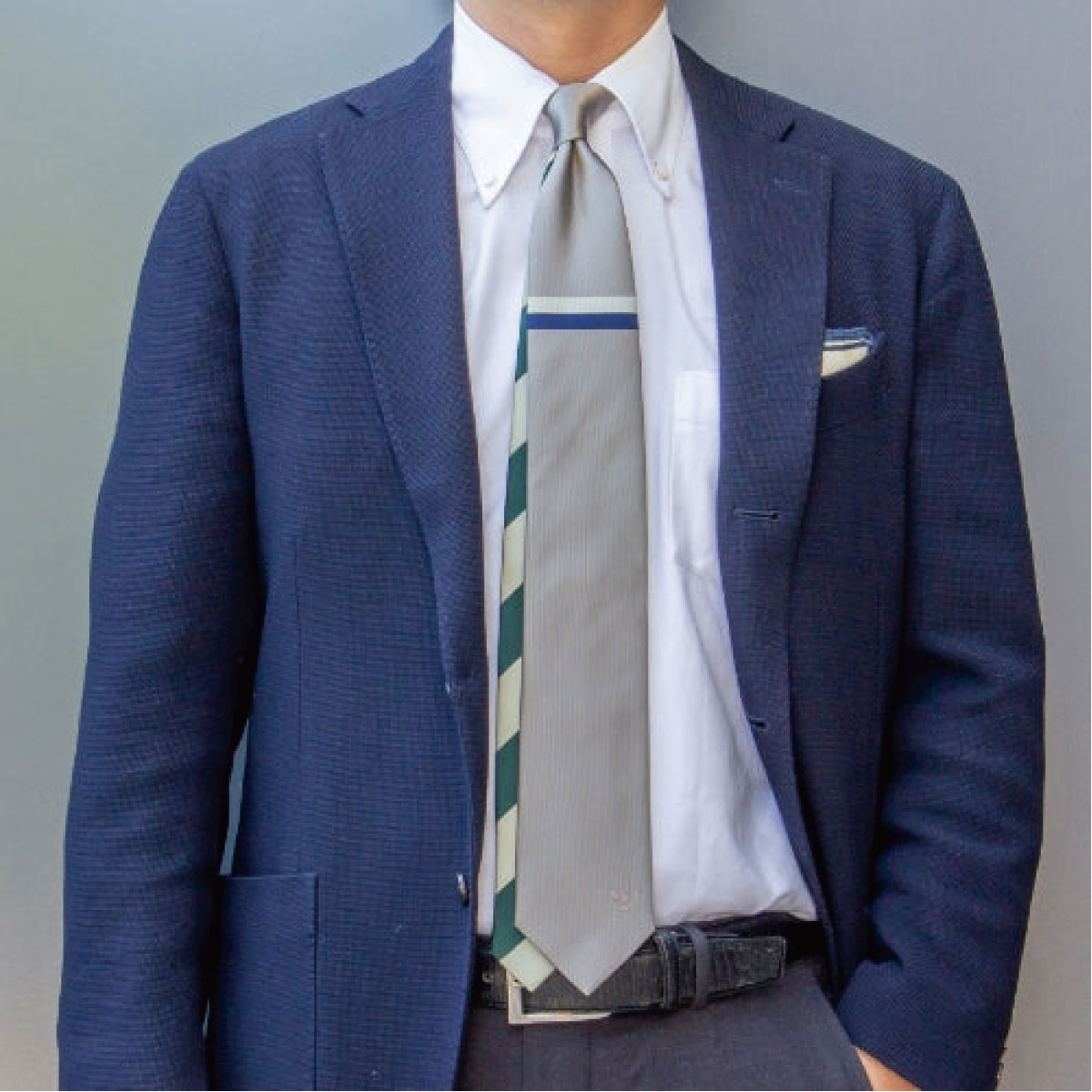とてもシンプルなデザインですが、まるでネクタイピンを着けているようなノット下の横ラインが、見る人の印象に残る1本です。