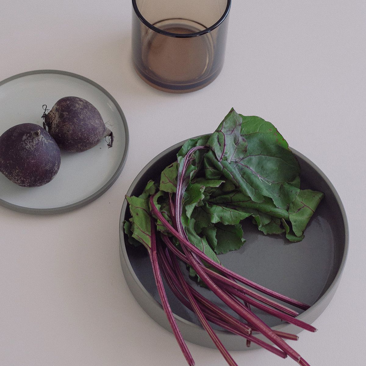 グレーの磁器で構成したコレクション。ブランド共通の直径モジュールと素地のマットな質感で、プレートやボウルは、高さをオリジナルコレクションの半分に。