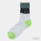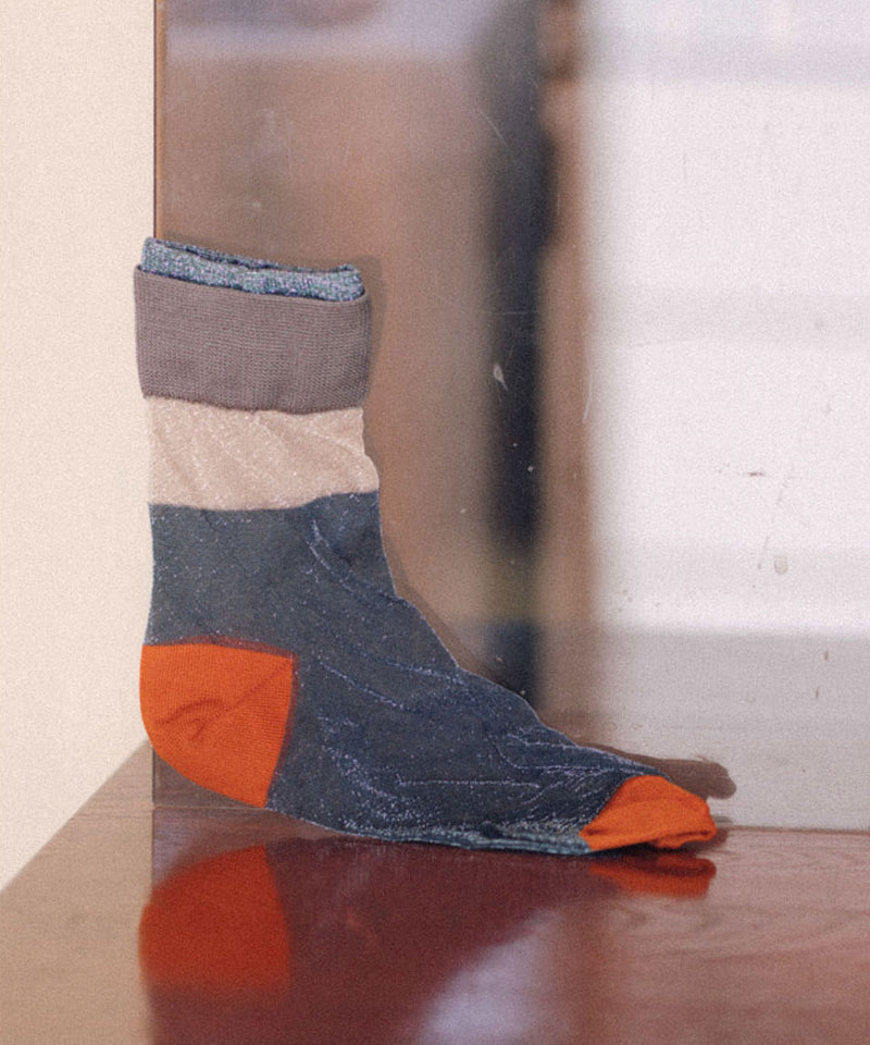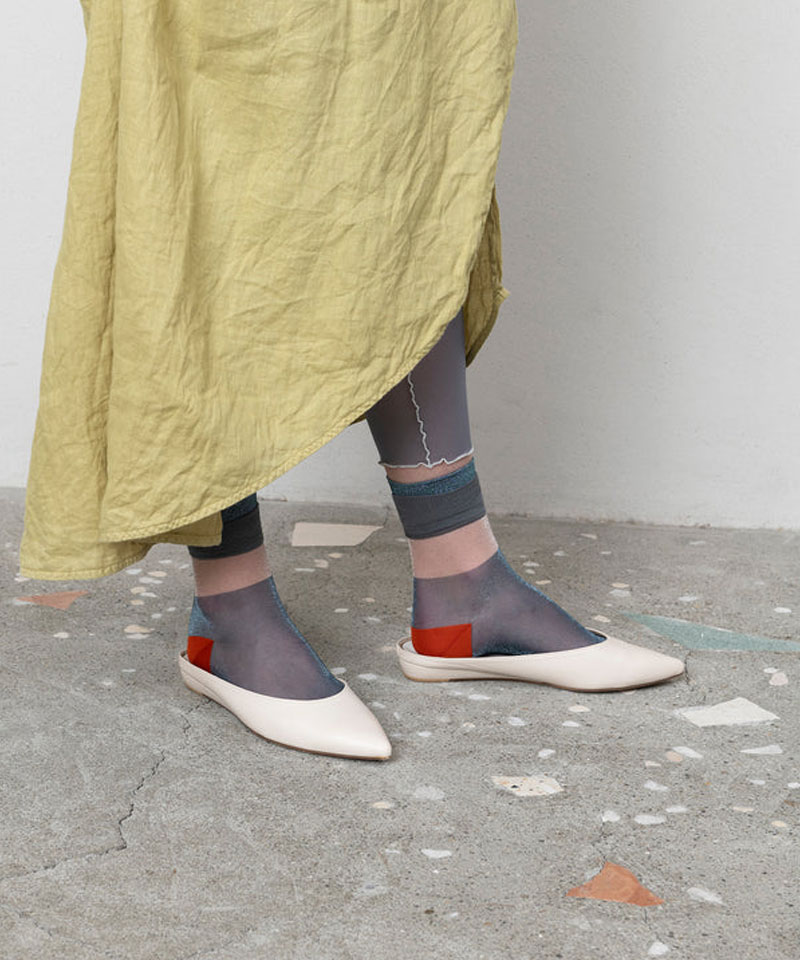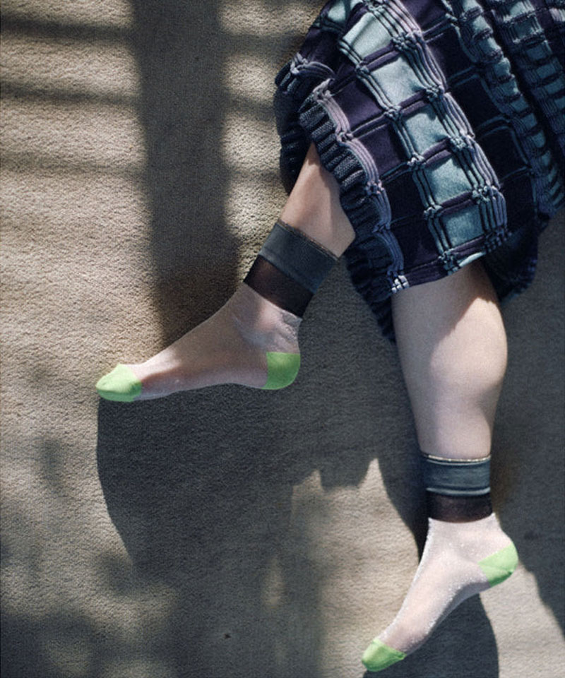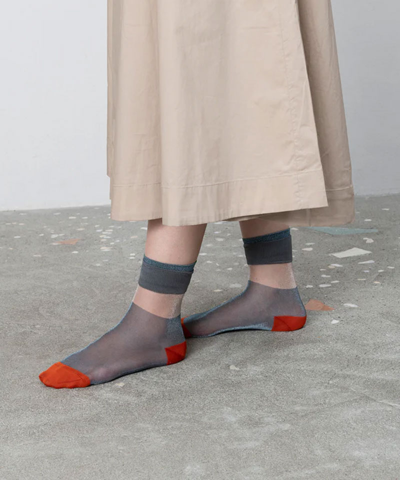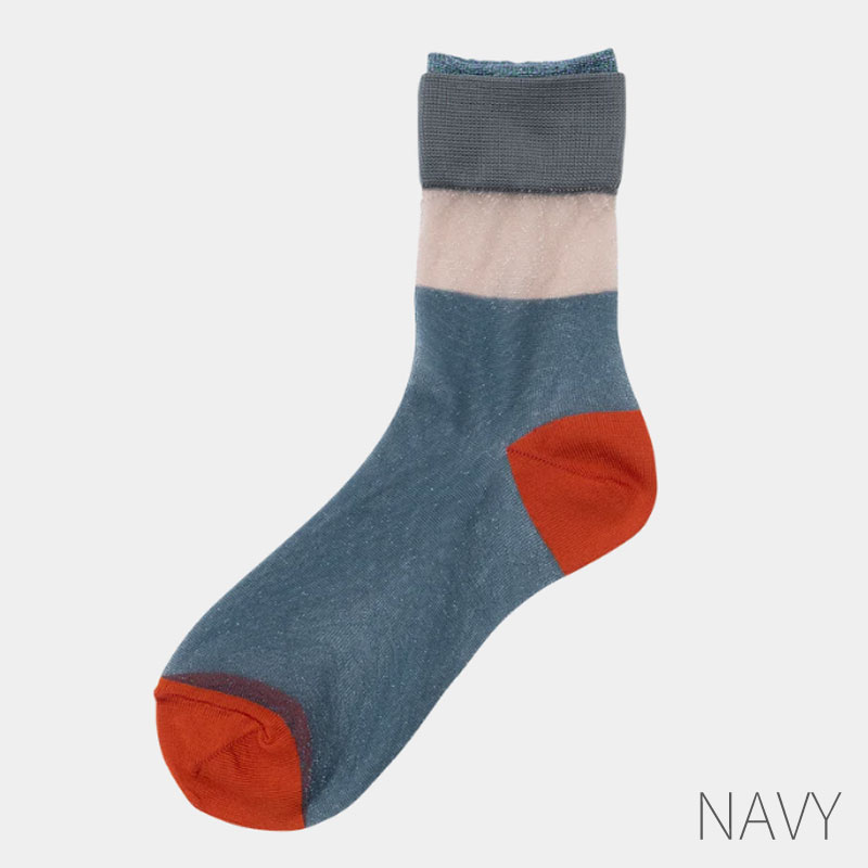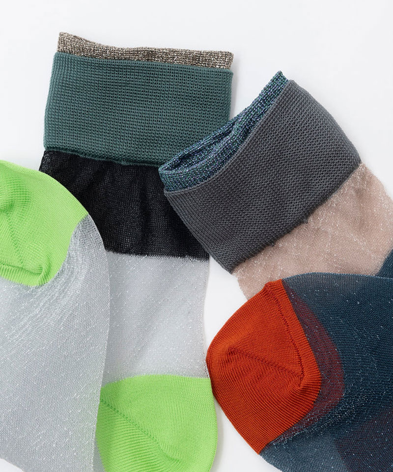 シアー素材とラメ素材を使用した配色のソックス。シンプルながらにこだわった素材を使用し、配色を楽しめるデザインです。二重構造の履き口もさりげないアクセントになっています。