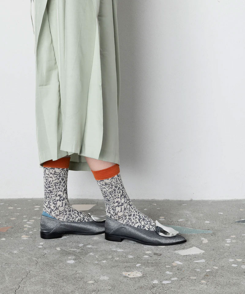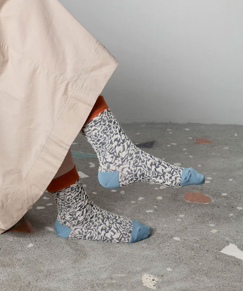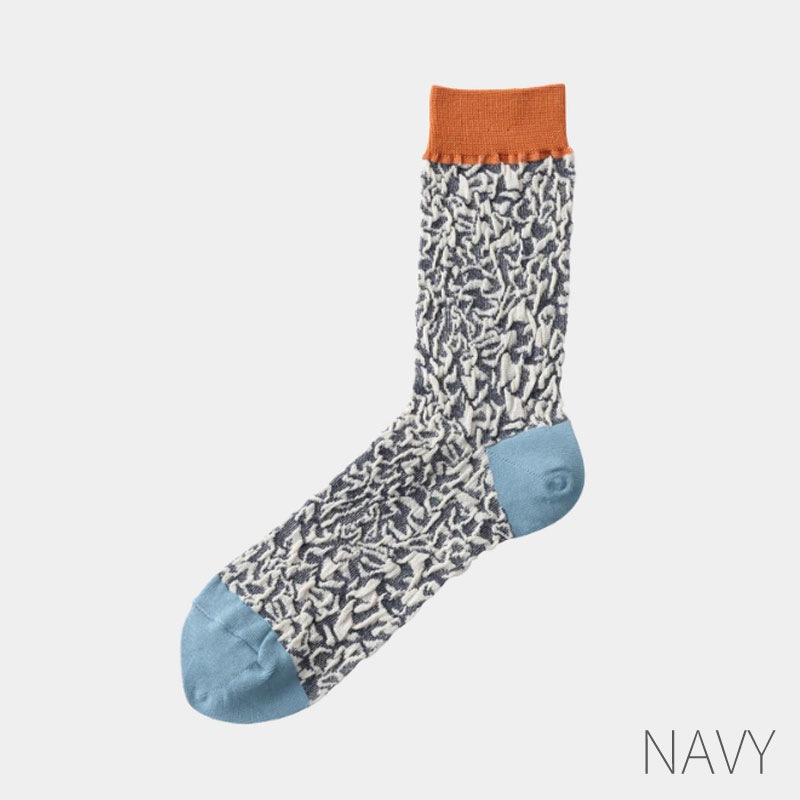 凹凸感のある生地感のテラゾ柄ソックス。男性でも女性でも足のサイズに合わせた凹凸感が楽しめるバンピーシリーズ。足のサイズが小さい女性が履くと、凹凸感のある生地感になります。足の大きいサイズの男性が履くと、生地が伸びフラット目な生地感になります。