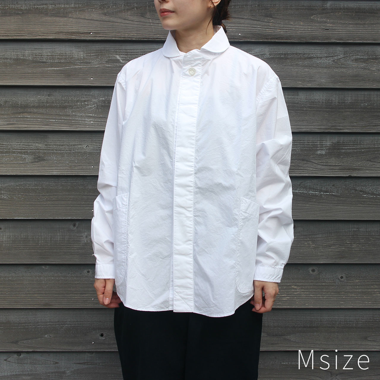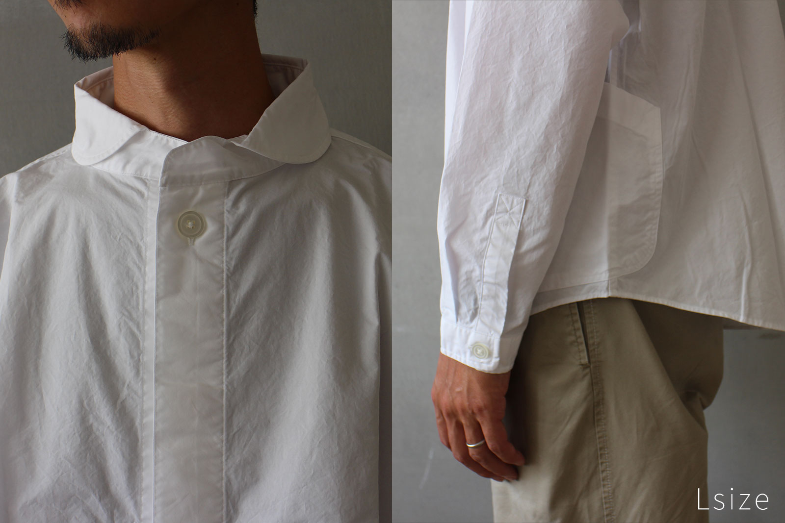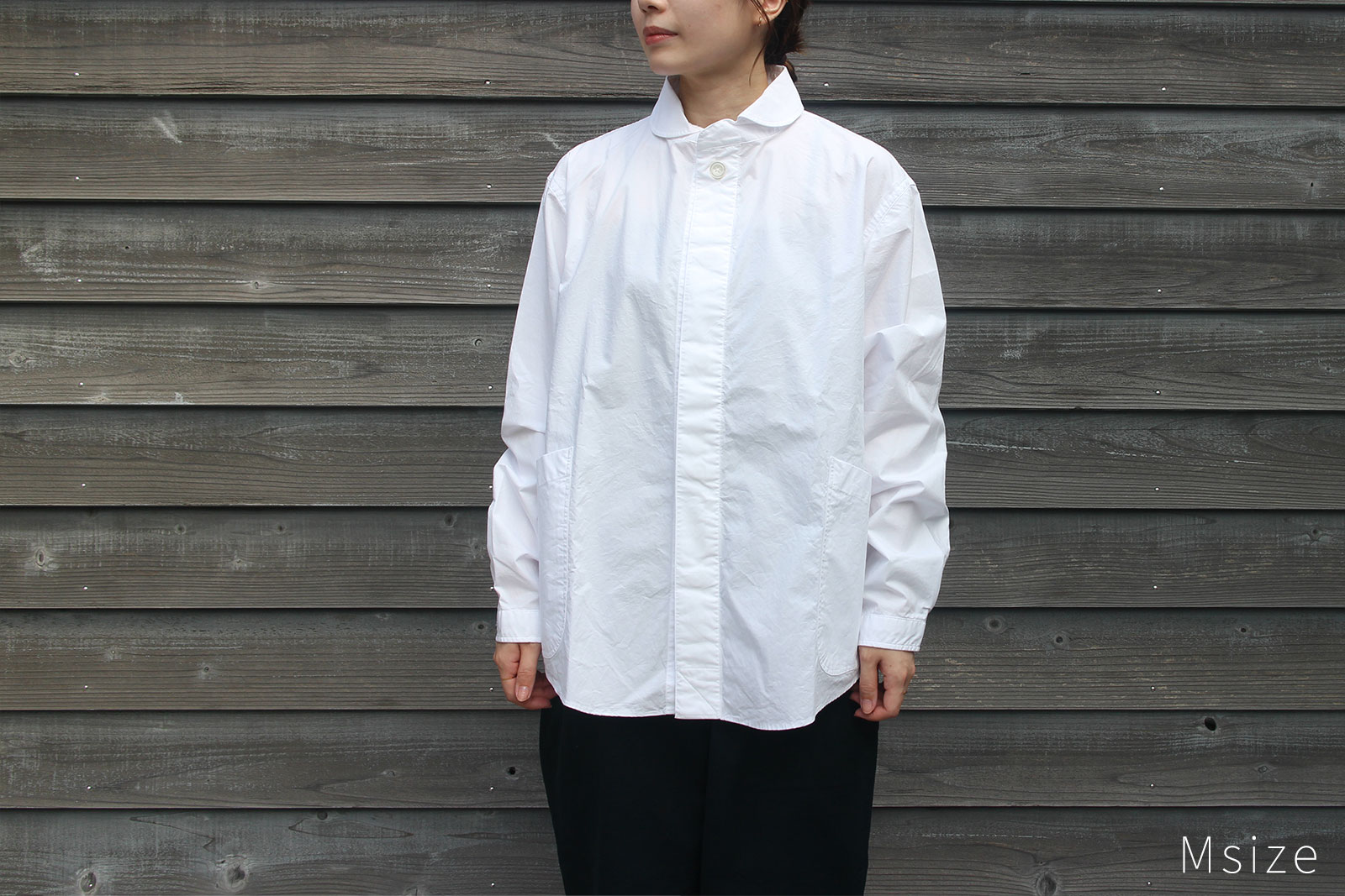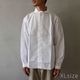 柔らかい印象の丸襟、フロント両サイドの大きなポケットのデザインなど、プルオーバーシャツの特徴はそのままに。ボタンを表に出さない比翼仕様ですっきりとミニマルな雰囲気に仕上げています。より着脱がしやすく、またスタイリングの幅も広い一枚になりました。