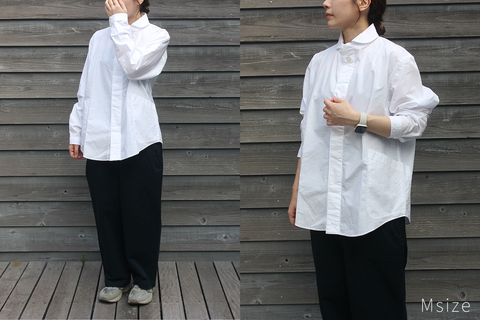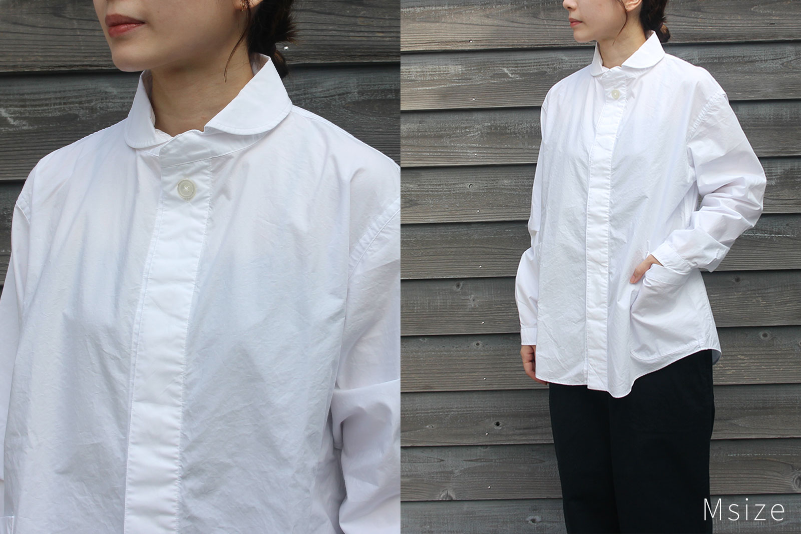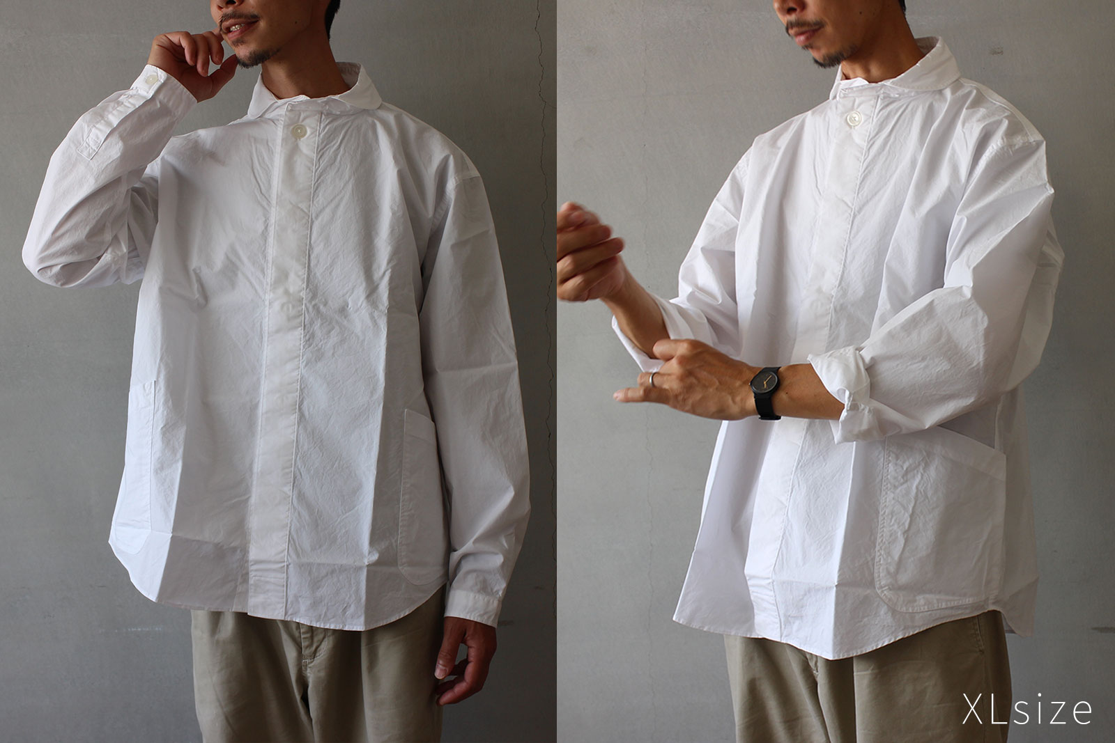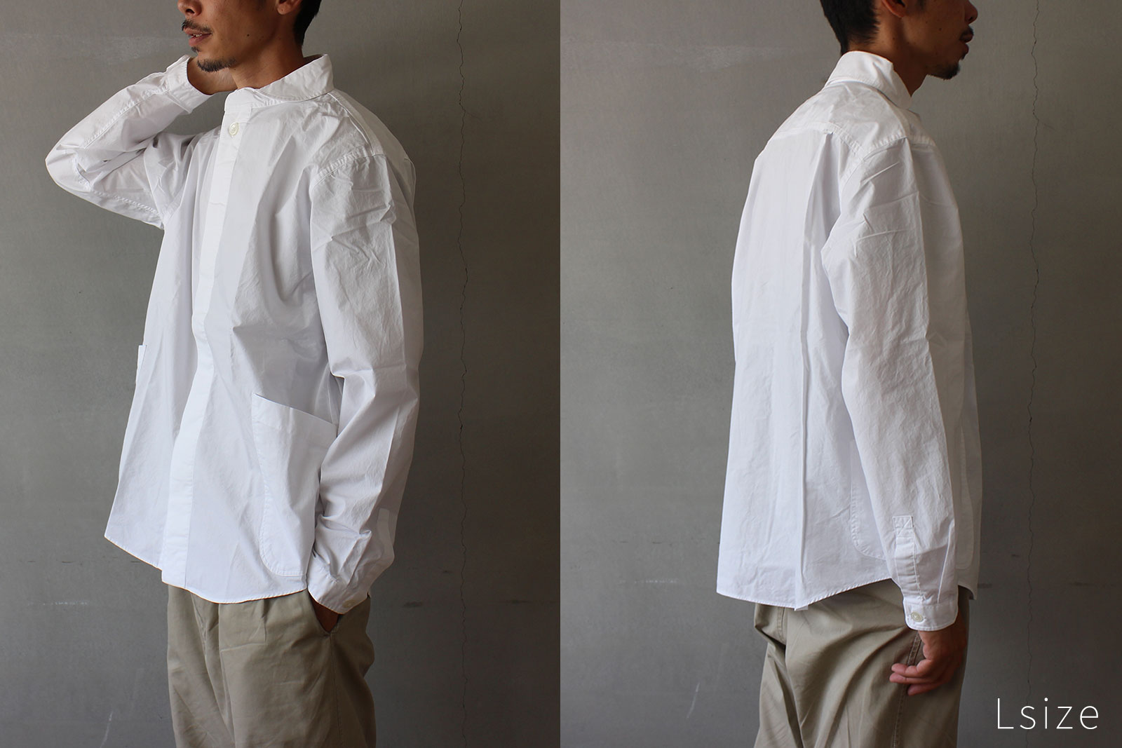 柔らかい印象の丸襟、フロント両サイドの大きなポケットのデザインなど、プルオーバーシャツの特徴はそのままに。ボタンを表に出さない比翼仕様ですっきりとミニマルな雰囲気に仕上げています。より着脱がしやすく、またスタイリングの幅も広い一枚になりました。