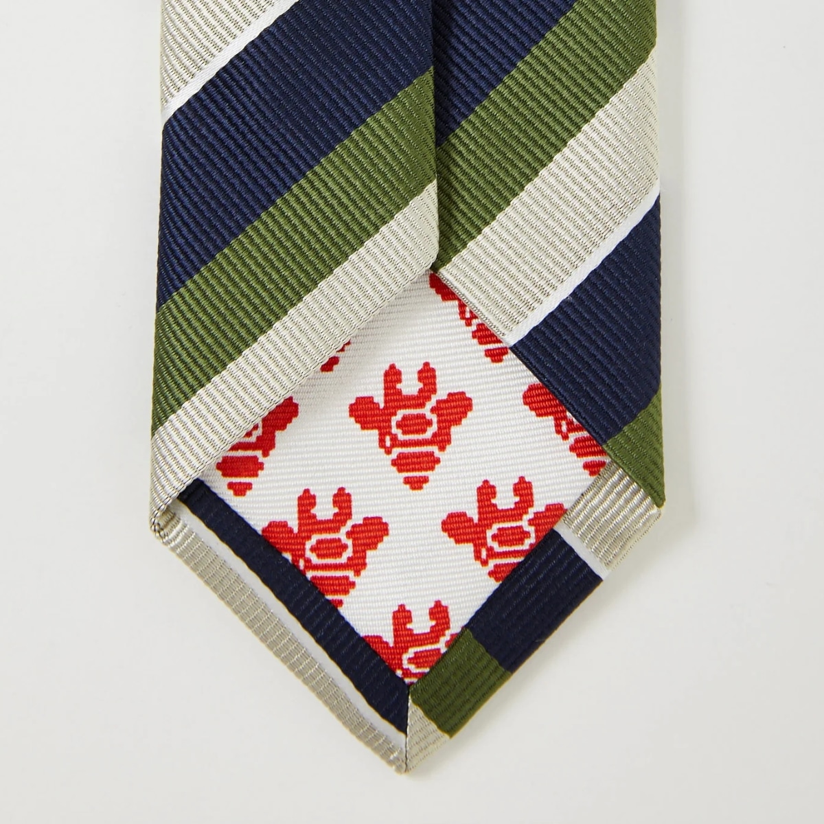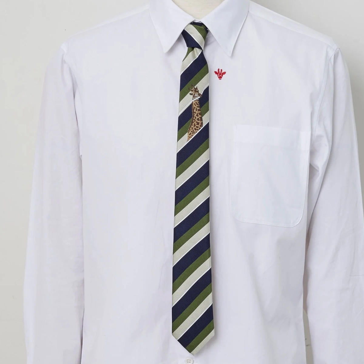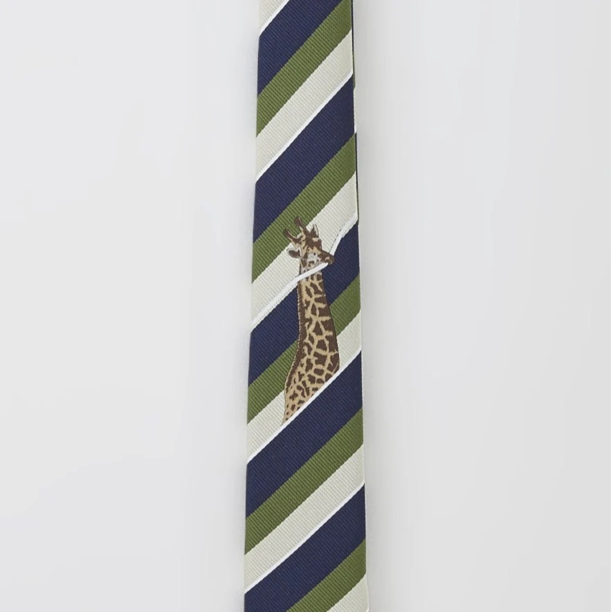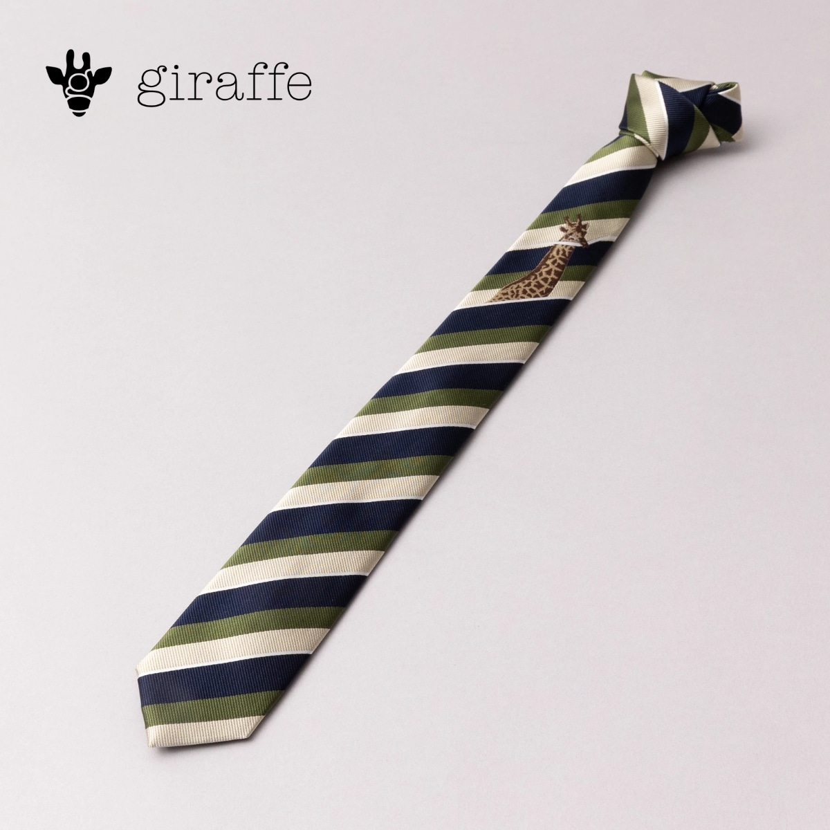 レジメンタルのラインをキリンが銜えているユニークなデザイン。ノット下のあたりにキリンがのぞき、胸元のアクセントになります。