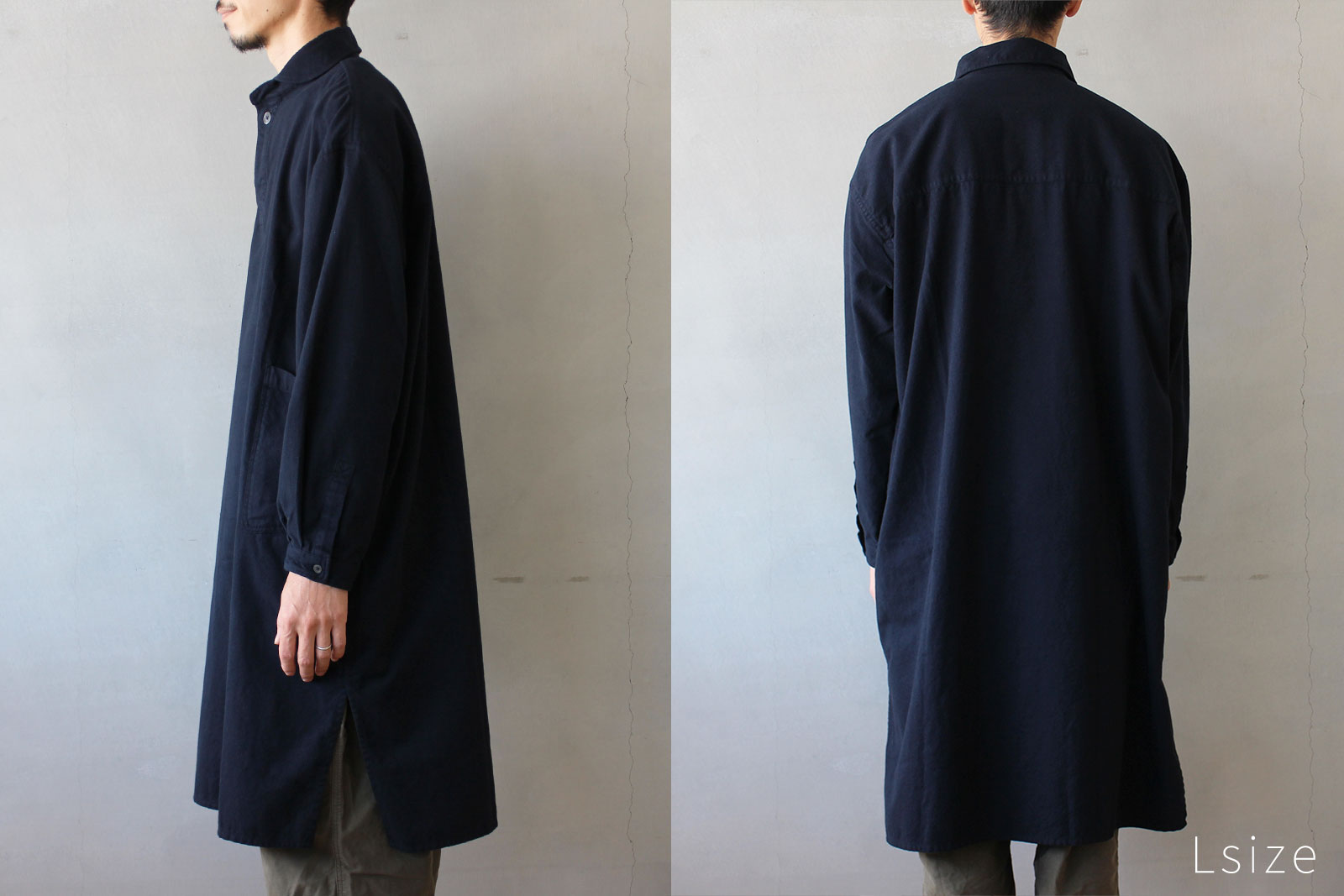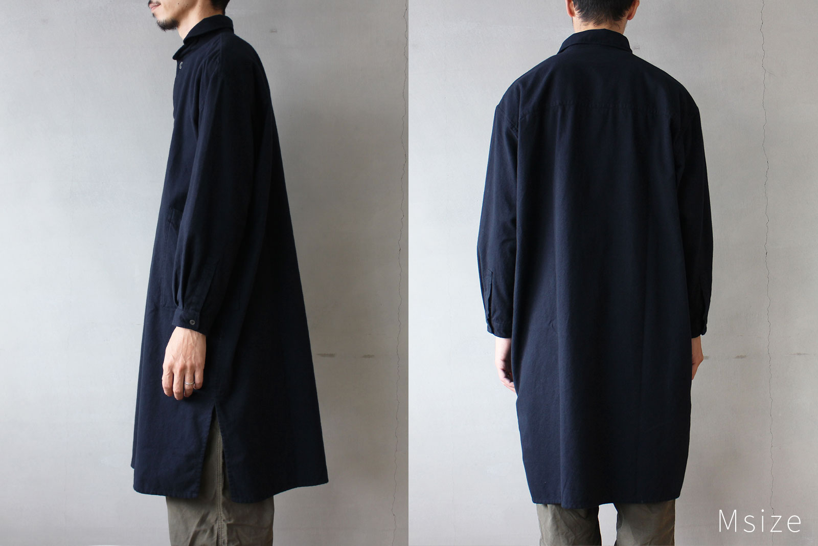 裾にはサイドスリットを入れ、足さばきがよくボトムとのバランスも取りやすい仕上がりです。
