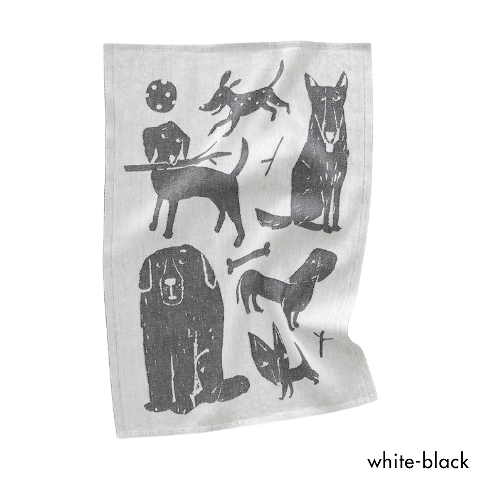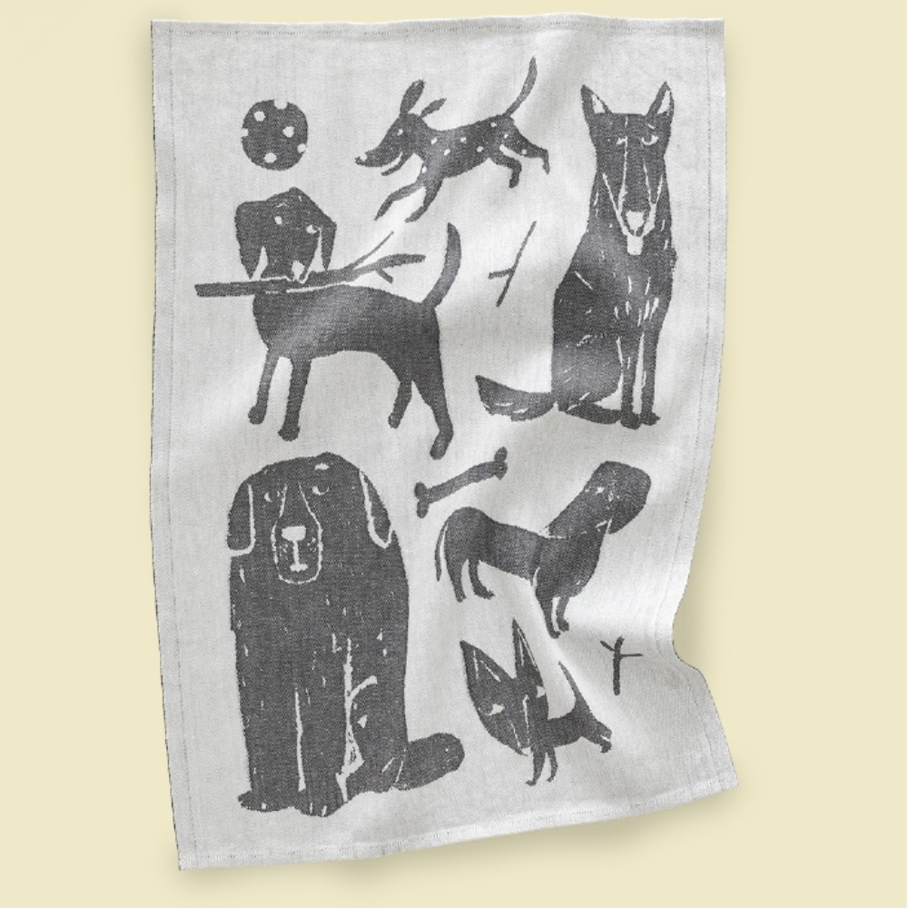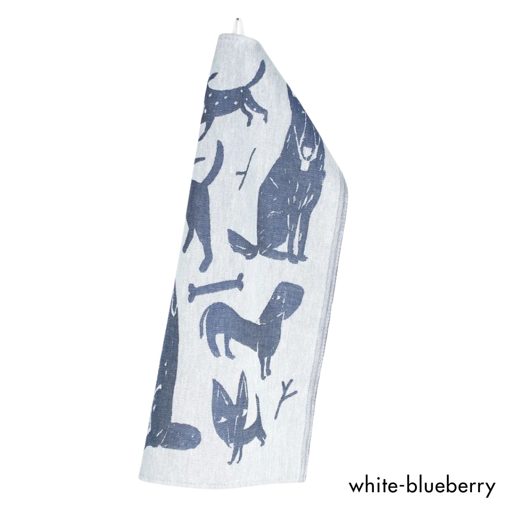 フィンランドのイラストレーター、マッティ・ピックヤムサが描くどこかマイペースで親しみやすい絵が織られたKOIRAPUISTO(コイラプイスト)キッチンタオル。愛嬌のある犬たちが集まっています。