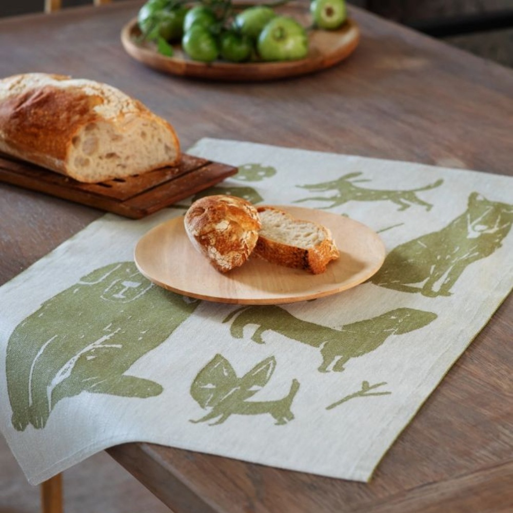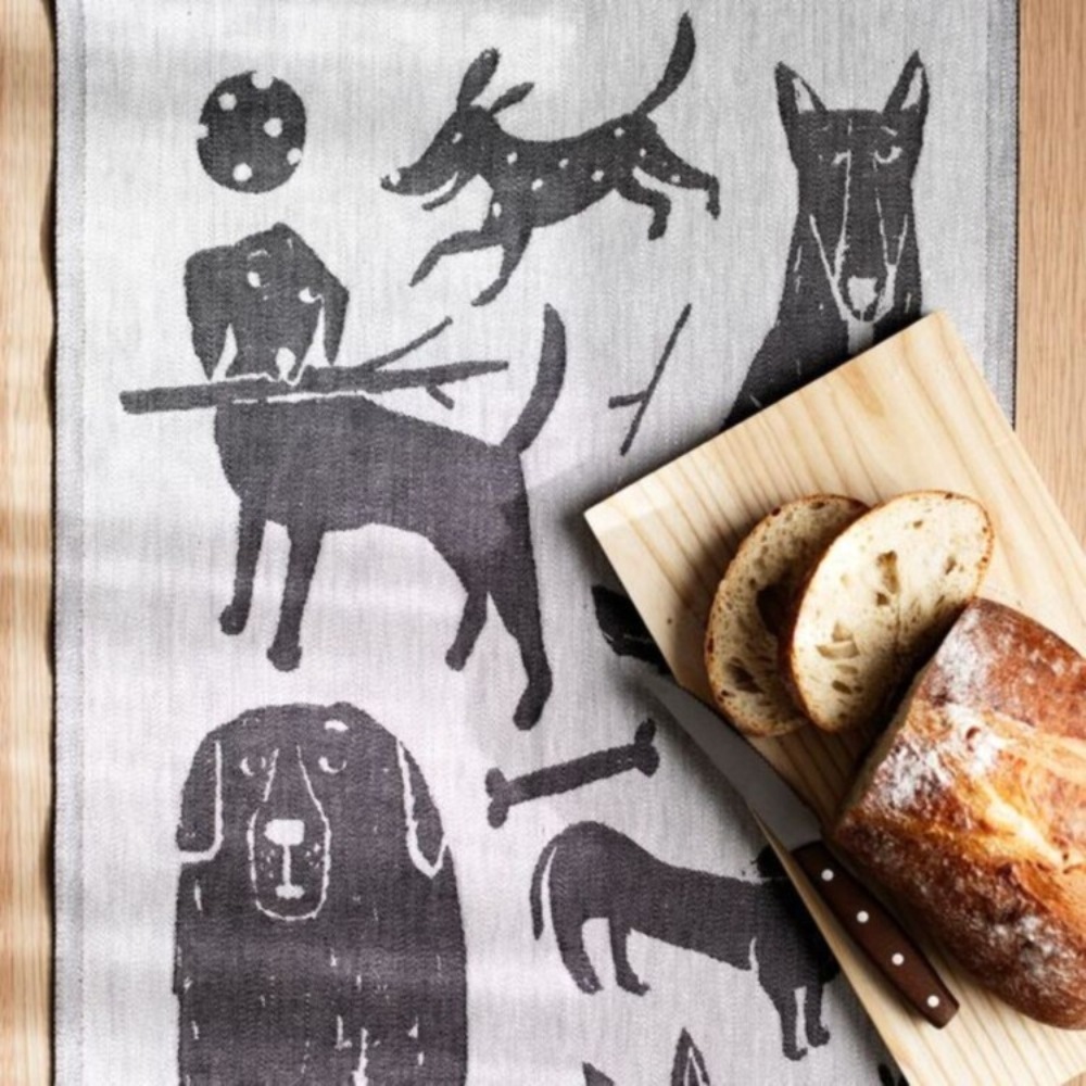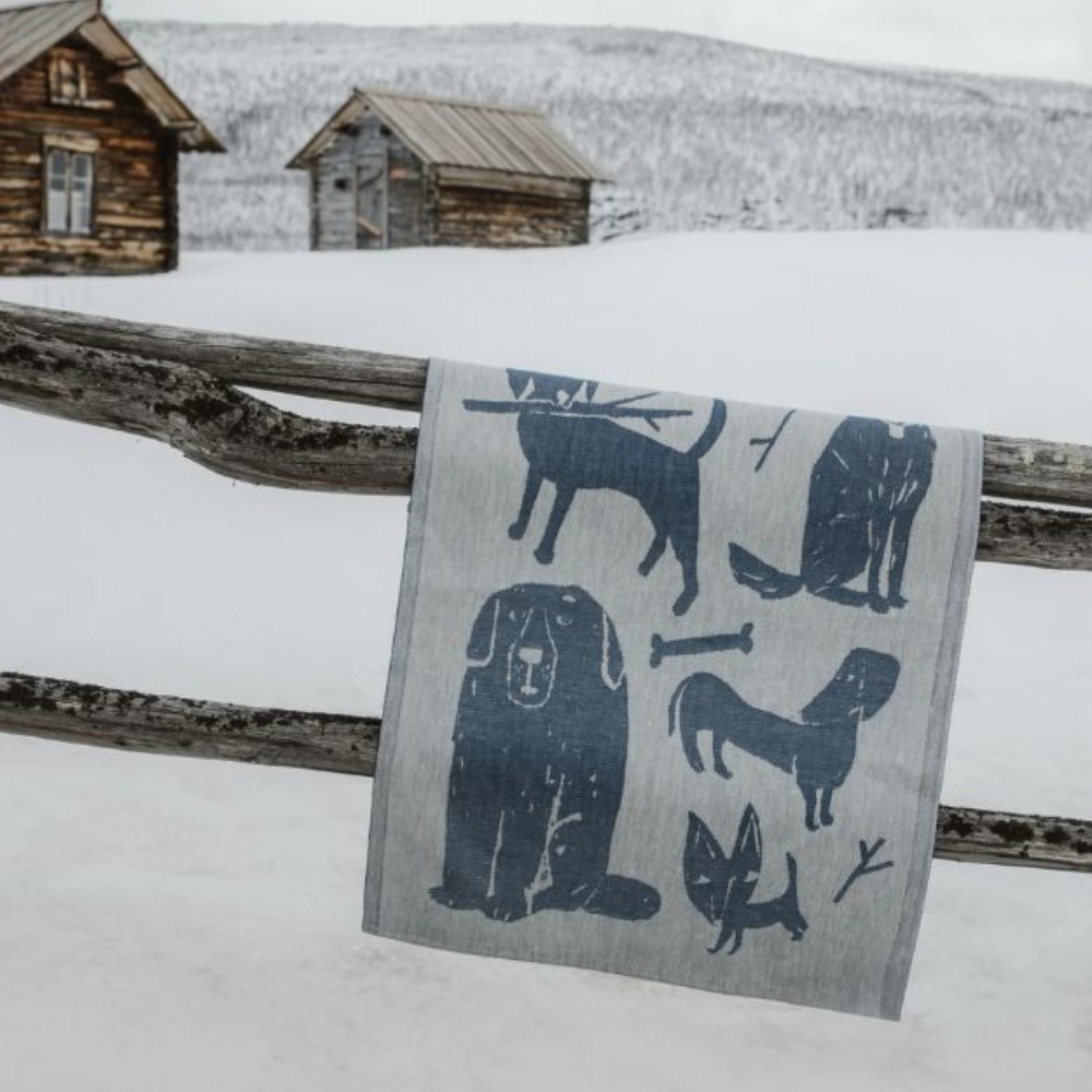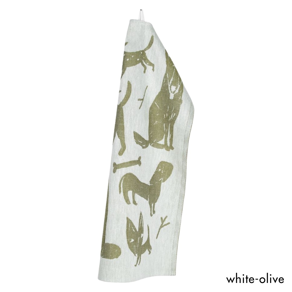 フィンランドのイラストレーター、マッティ・ピックヤムサが描くどこかマイペースで親しみやすい絵が織られたKOIRAPUISTO(コイラプイスト)キッチンタオル。愛嬌のある犬たちが集まっています。